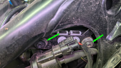 The plug that crosses over the area on the right side is held to its bracket with a tabbed slide contraption. Here's a photo showing it removed. I had a helper wiggle it off while I pushed on the tab with a small screwdriver from the left side of the bike.