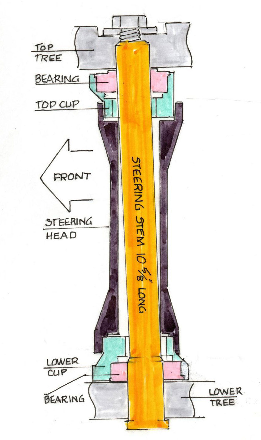 3. Clean the steering head bottom thoroughly. Test fit the snugness of your bottom concentric cup in the steering head. It is machined for a press fit. If the bottom cup is sloppy, you’ll need to drill a 3/16” hole through the steering head and part way into cup to lock the two together with a 3/16” roll pin. The roll pin must be deep enough to create strength from banging of the steering stops on your lower tree. Don’t drill into the bearing area. Not good! Position so the fat steering stop tab is straight forward. Install cup in tree.