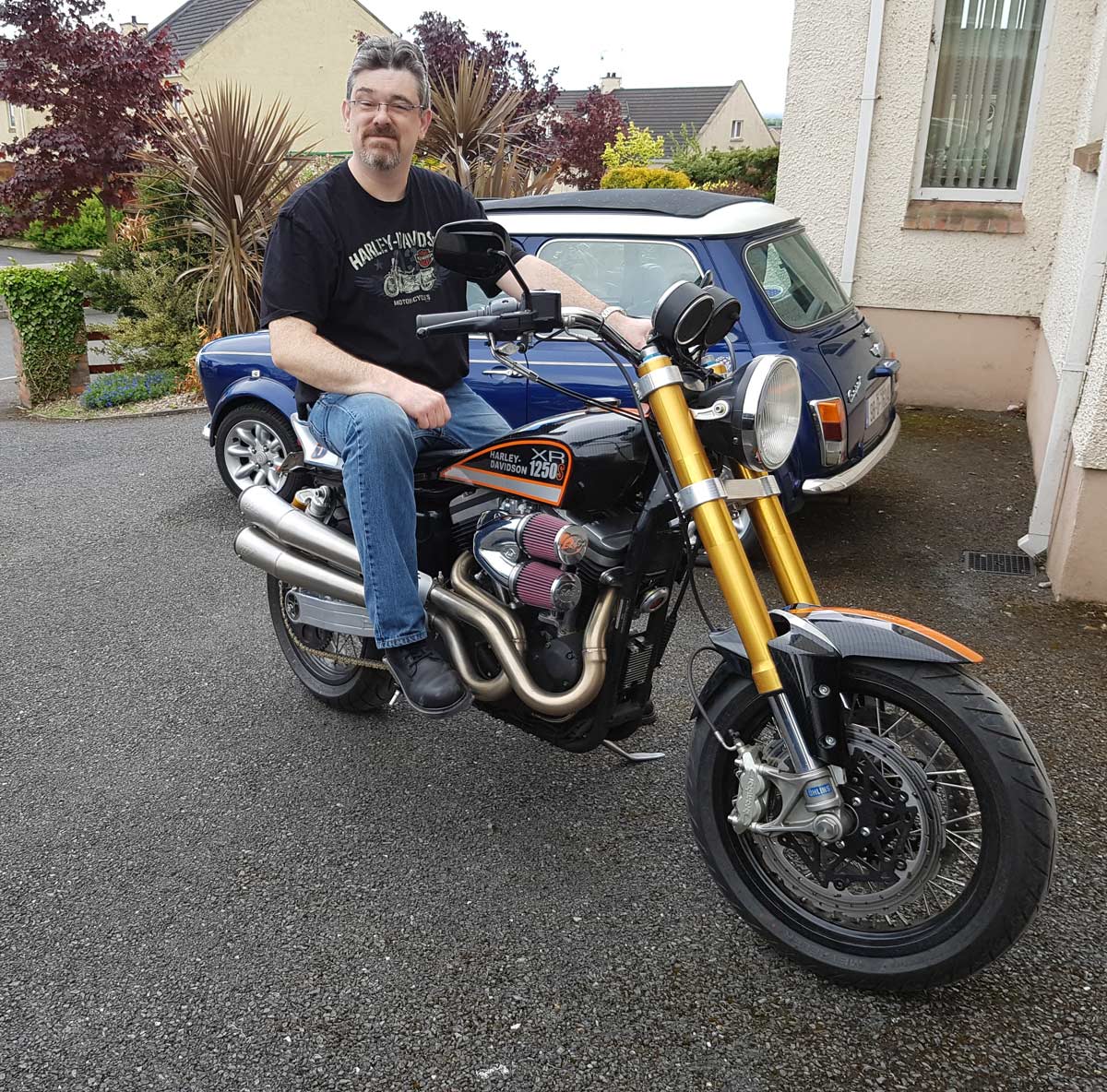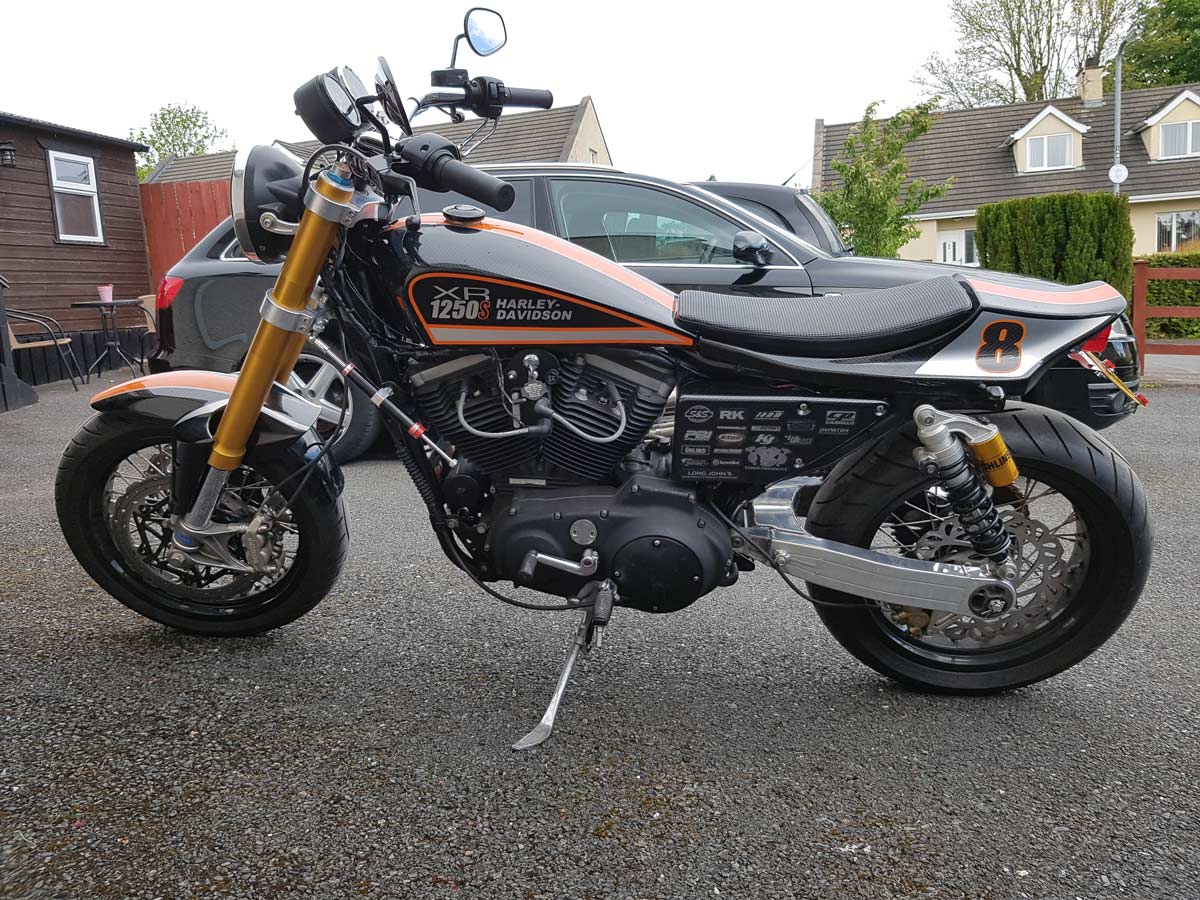 Jeff Smith from Northern Ireland has created a departure bike. The basic part (frame and engine) are normal Evo, then he went nuts with modern stuff: modern boxed swing arm, upside down forks and I assume wheel/brakes/fender from the host bike, fancy snorkel carburetor intake all topped off with a SuperTrapp.